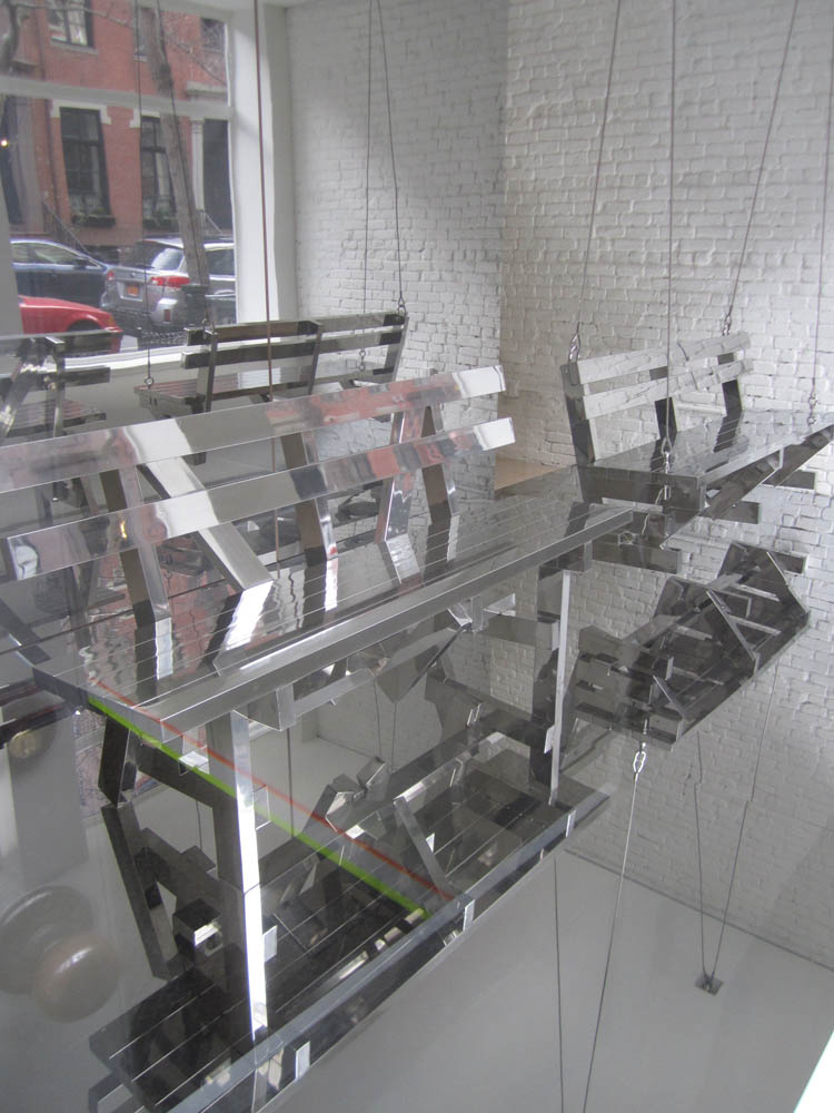 Lastly, this Greenwich Village townhouse has had us puzzled for the past couple of months on our daily walks past it. In the storefront of what used to be a hair salon now sit two mirrored benches; one a swing the other static. I imagined some sort of new age church or meeting house with funky pews, or some sort of cool, minimalist art gallery, but a few weeks ago I finally had the opportunity to ask a neighbor as she entered her building if she knew what the mirrored benches were all about. Turns out that it’s a private home and the mirrored room (floor, ceiling, walls as well as bench/swing) are all part of the playroom/guest room. This is not your childhood playroom. I’ve been sort of stalking the place (not really, but I do pass by often on my way to and from home) and was able to catch a glimpse of the open guest room, (with its orange mattresses), as well as the super-cool multicolor striped stairs that lead up to the rest of the house. The architects behind the project are Solomonoff Architecture Studio and professional photos of the entire project are due out in an undisclosed architecture periodical shortly, which should look a lot better than these (the reflective space is especially difficult to photograph.) I’m curious to see what the rest of the house looks like…