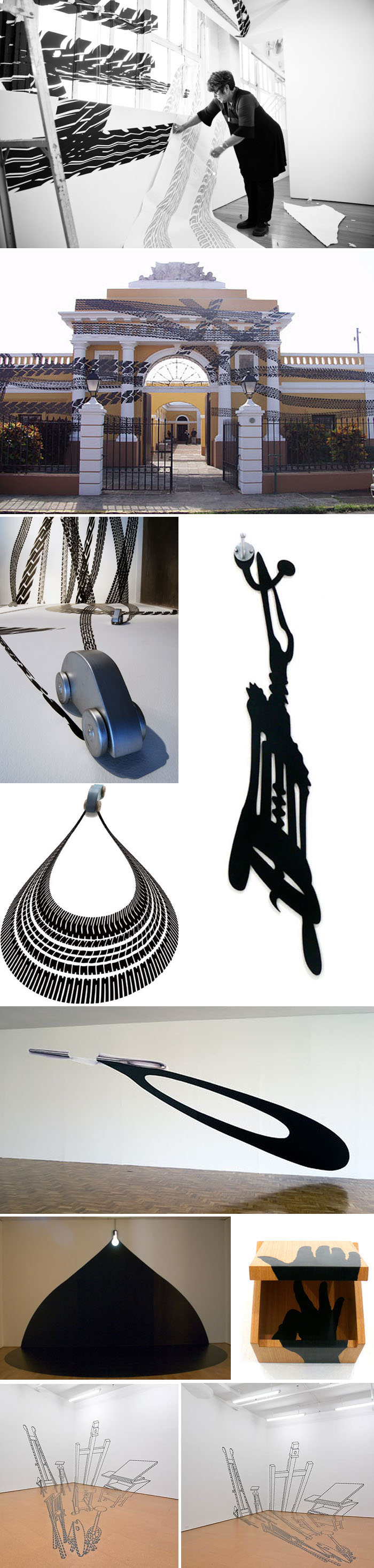 Brazilian artist Regina Silveira was so ahead of her time. She’s been creating installations using plotter cut black vinyl adhesive years before blik came into existence! Her large-scale installations play with perspective, shadows, and space in general. Her Track Series (Derrapagem which translates as skid marks) go from floor, to walls to the most unlikeliest of façades. Her exaggerated shadow pieces are humorous and clever, often tricking the eye.