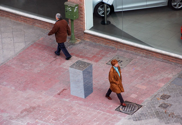 Spanish street artist e1000 (previously here and here) has recently painted another of his 3D works. This one on Paseo de Santa María de la Cabeza in Madrid, gives the illusion (when seen from above street level) of a pedestal emanating from the street. Passersby, unknowingly, suddenly appear to be elevated in a statuesque manner. Fun!