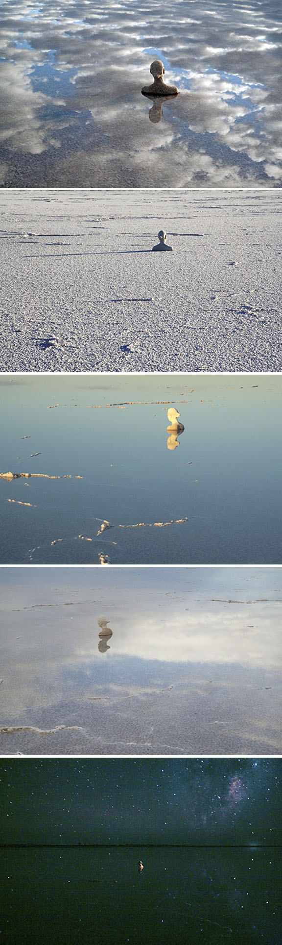 In Headspace, Davis used salt harvested from Lake Brown in Western Australia to create a cast of her head and shoulders. After, she reintroduced the sculpture to its original source and documented its dissolution over a 9 week period.