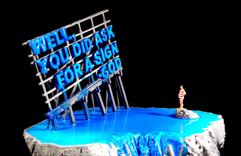 Religion often serves as an emotional ‘lender of last resort’ in times of crisis. The idea for this series of maquette sculptures, comes from Christian church signs and billboards in the US. By stripping these religious quotes away from their physical and emotive context, the ‘message’ becomes more absolute, almost surreal. To emphasize this further, the text size has been exagerated in scale (compared to the figurines) and colour. The project is somewhat ‘street’ influenced by large scale advertising and slogan graffiti. The title of the series generates a contrast: The notion of God-sent miracles as an integral part of religious faith, against the marvels of man-made, modern age, industrial technology and it’s products such as fluoerscent materials and colours.