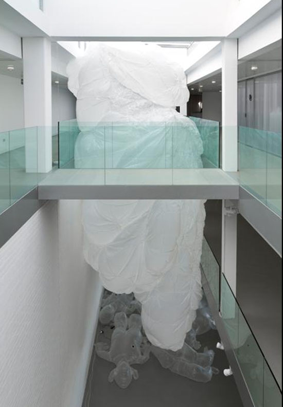 We certainly have posted our fair share of inflatable sculptures and installations, but somehow each one has its own personality and style. This exhibit, Aire (Air), a few months back at the Mustang Art Gallery, is an installation by Spanish artist Olga Diego. Working with plastic, both translucent and transparent, and plastic bags, along with electronic circuits that inflated and deflated each structure, Diego filled the gallery with six separate inflatable works that interact with each other and with those who viewed the show in its space. Some of the pieces allude to well-known images such as Duchamp’s The Bride Stripped Bare by her Bachelors, Even, and the hanging man to Christ. Some of her shapes are organic in form and complement the more figurative ones nicely.