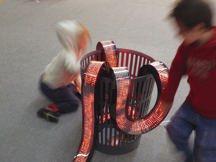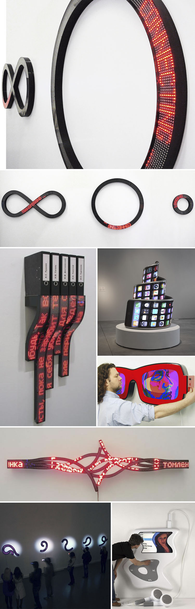 Moscow-based contemporary new media artist Aristarkh Chernyshev creates sculptures that integrate today’s technology while commenting on our obsession with it in a humorous fashion. His LED sculptures play with the idea of information overload, in some instances grabbing real-time news feeds from the internet, winding them around the LED lightboard strips through the trash as in his work Urgently! (top two photos), or winding around endlessly in a knot as in Knode (third from top), as well as taking poetic texts and breaking them apart then reuniting them as stock exchange rates in Lyric Economy (second from bottom).