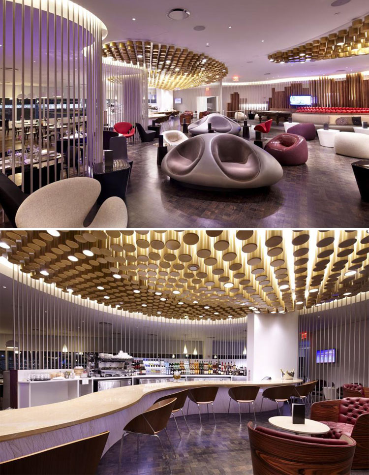 Virgin Atlantic’s new JFK Clubhouse – designed by our good friends James and Hayes Slade of Slade Architecture – opened yesterday at JFK International Airport here in NYC. The 10,000 square foot lounge includes a beautiful curvy bar, cool seating such as the also curved, oversized, custom-made flame red ball sofa, and a large maple wood and burgundy billiards table in the ‘Entertainment Zone’. Bumble and Bumble has opened their first US airport salon and spa as part of the Clubhouse, as well.