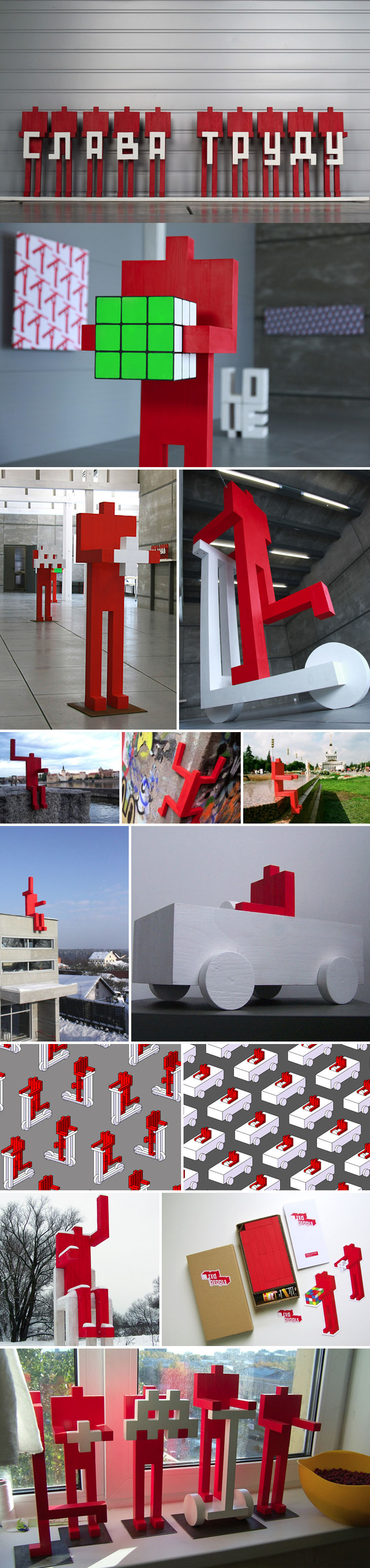 The Red People project, created by Andrey Lublinskiy and Maria Zaborovskaya of the Pprofessors art group, is a modular system used to assemble an anthropomorphous character, sometimes large, other times small, out of 13 wooden blocks. Working in practically any context and integrated therein, these Red Men have become a sort of viral phenomenon around Moscow and its environs. So much so, that they have become stars of comics and political debates, and are slowly making their way across the world.