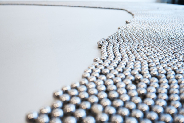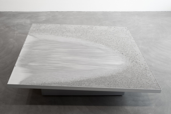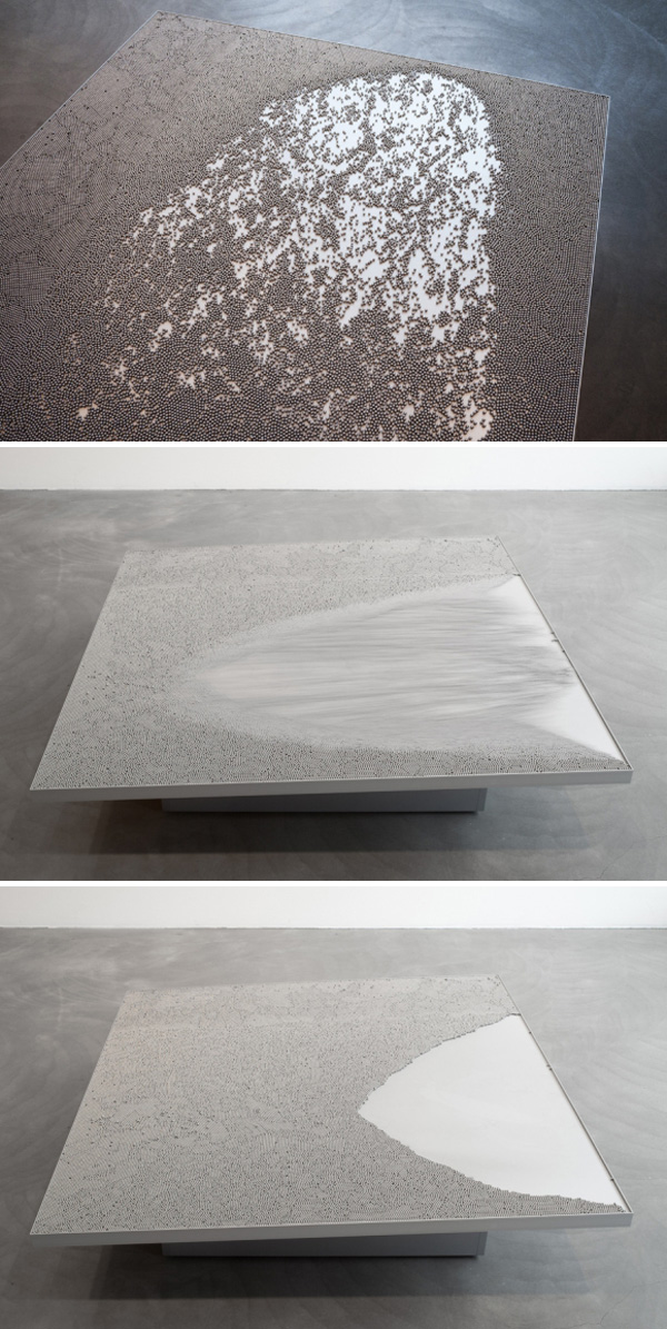 Their latest work, currently at the Armory in Galerie Anhava’s booth, is subtly dramatic creating an appealing and soothing sound. The piece, titled Wave of Matter, consists of a large metal sheet low to the ground with thousands of small metal beads on top, automated to tilt ever-so-minimally every minute or so. The result is visually stunning with all the beads shifting to the other side, creating a similar effect to sand along the shoreline as the water retreats. The swishing sound of the metal beads is also very water-like. It’s quite mesmerizing. Probably best to see it in action, as in the video below: