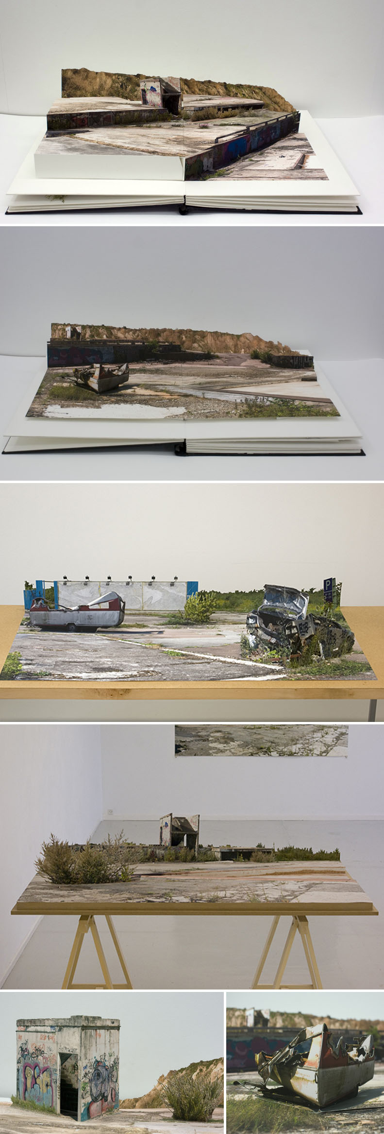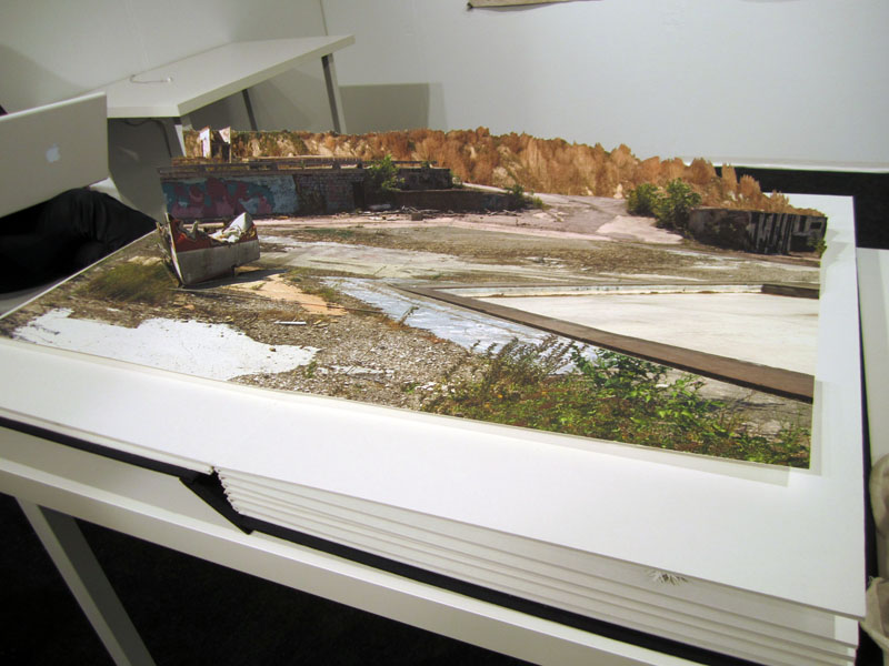 I came upon these impressive photo collage pop-up books at the Volta art show here in NYC last Friday. Swedish artist Andreas Johansson has been drawn to industrial and desolate areas ever since his youth as a skateboarder in Vaxjo. Working in collage, cutting apart photographs and then building up new environments of the abandoned industrial kind has been something Johansson has done for a while. In his solo exhibit titled From Where the Sun Now Stands, he has taken these ‘sets’ and created a series of oversized pop-up books with 6 pages each, showing different perspectives of the same vacant lot. Turning these large pages and seeing these pages come to life was an interesting departure from the pop-up books (that I loved) of my youth. You can see the pages being flipped at the bottom of this page here.