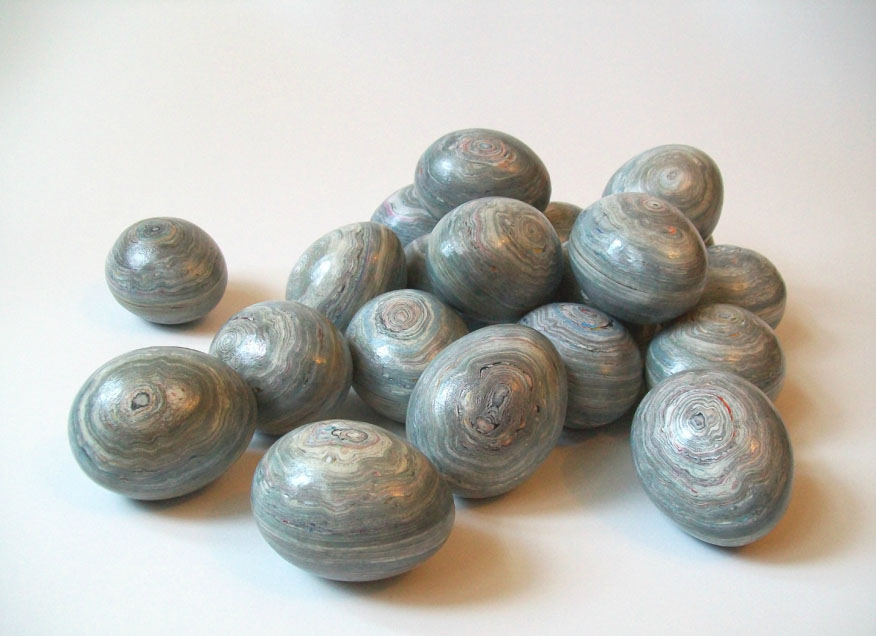 What first drew me to Dodd’s work were her Paper Eggs where she used recycled magazine pages glued in layers to revert them into a wood-like material. It’s very hard to believe that those eggs are made from paper! Julie Dodd’s choice of eggs was done as a commentary on the decline of migrating birds to Europe due to loss of habitat and climate change all stemming back to the loss of trees. The fleeting nature of magazines converted into a permanent and significant object.