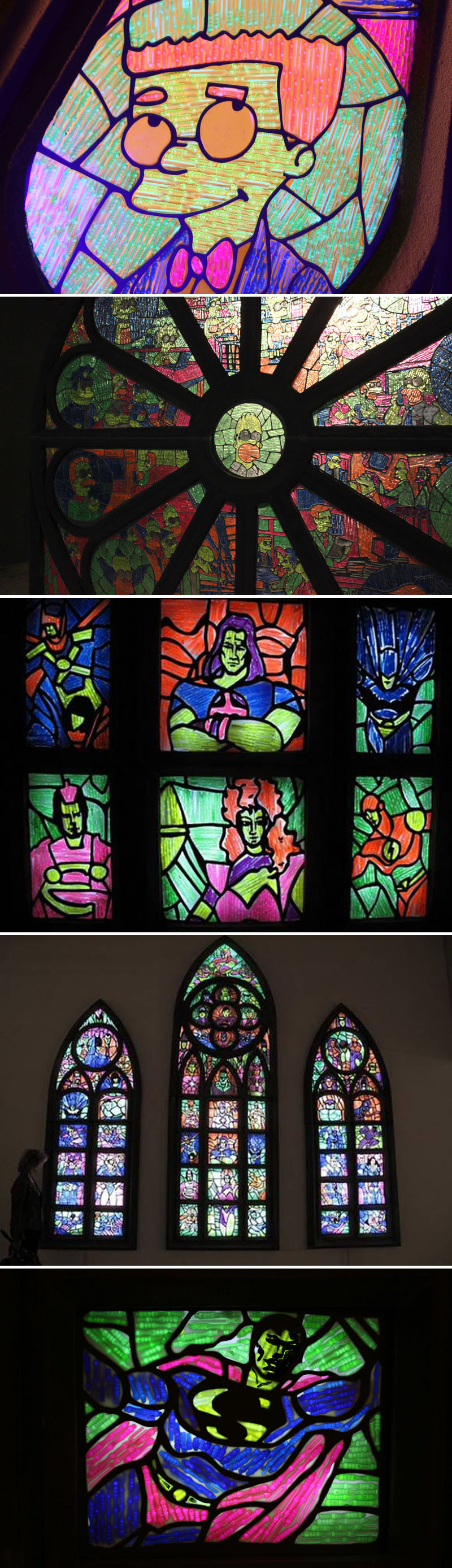 Here is more from the Recycle Group (previously here): these stained glass windows made from recycled plastic à la Recycle Group style, made me chuckle. Though my preferred window is the Simpsons rosetta, the Superheroes triptych windows are also well done. Continuing in their mixing of classical art with the recyclable materials of the present, Andrey Blohin and Egor Kuznecov definitely seem to be having fun with their art.
