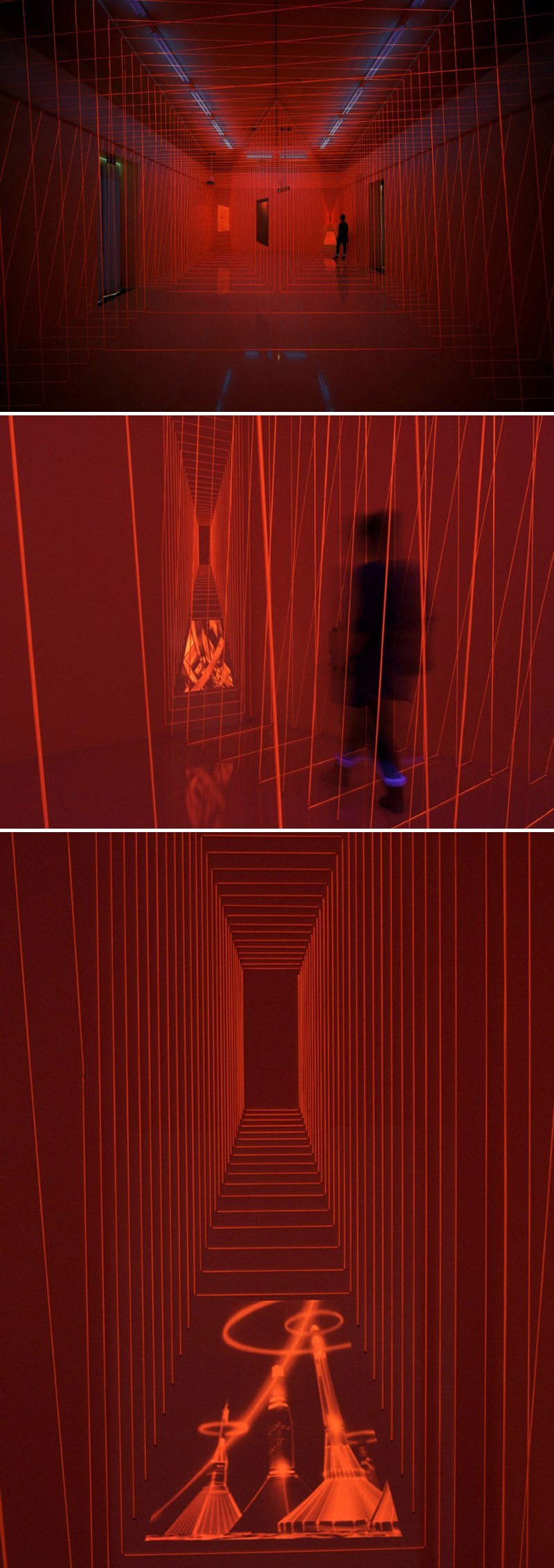 Last month in Freiburg, Germany, in commemoration of 111 years of electrical engineering at Alexander Bürkle, a technological company, a room was turned into an art installation combining video, paint, and beams of light creating a surreal and futuristic interactive environment. The installation by Chezweitz & Roseapple in collaboration with kubix and Stefan Hurtig was titled Freude auf Morgen and invited visitors to walk through the red fluorescent tunnels of light and ponder time and technology. Cool.