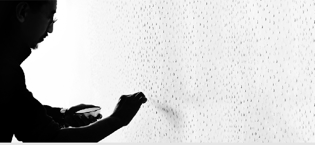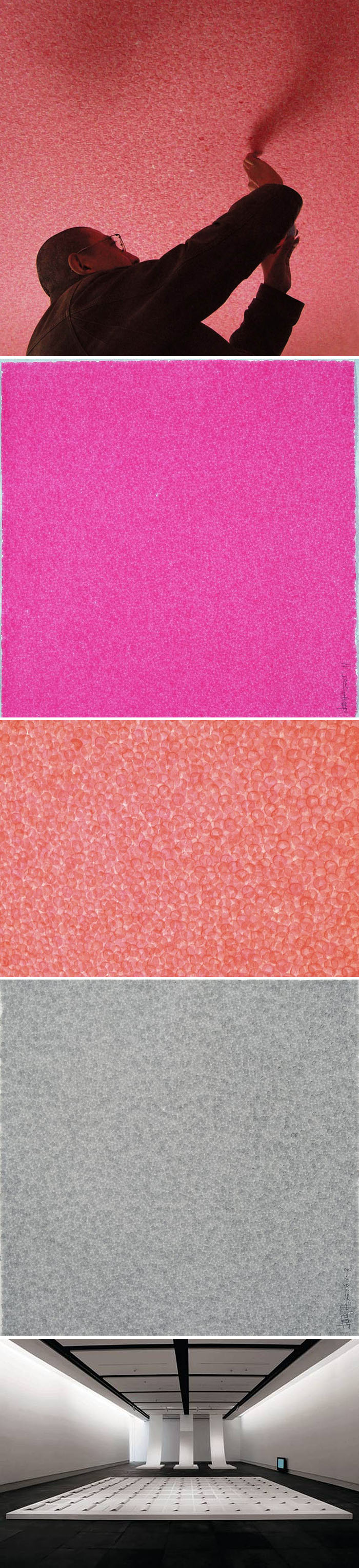 Chinese artist Zhang Yu has been working on his Fingerprint Series, in intervals, since the early 1990s. These paintings become a meditative process by repeatedly pressing his right index finger on rice paper with ink. Zhang limits his colors to shades of red, white and black, leaving thousands of overlapping fingerprints that create a unique infinite visual effect. He has created paintings, installations, books and performances with this process, making him a key figure in contemporary experimental ink painting.