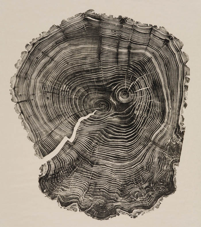 Gill reveals the sublime power locked inside their arboreal rings, patterns not only of great beauty, but also a year-by-year record of the life and times of the fallen or damaged logs. The artist rescues the wood from the property surrounding his studio and neighboring land, extracts and prepares blocks of various species—including ash, maple, oak, spruce, and willow—and then prints them by carefully following and pressing the contours of the rings until the intricate designs transfer from tree to paper.