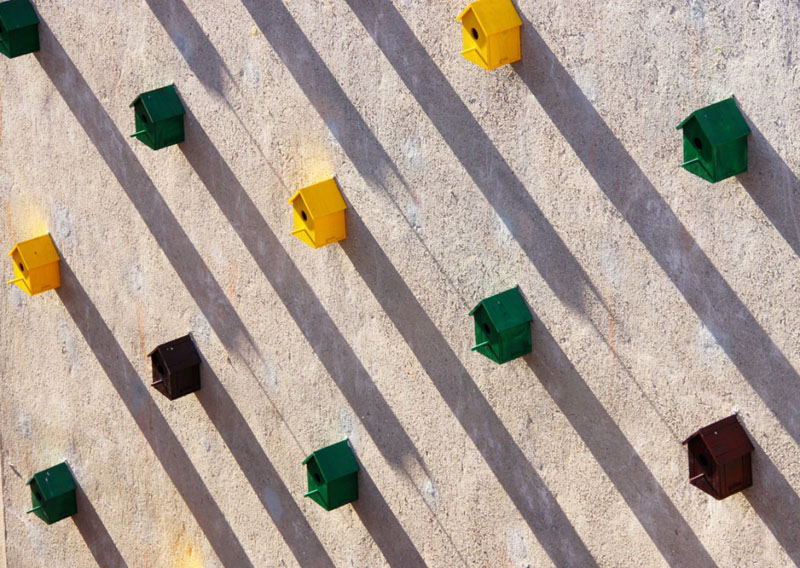 In Barrio de Gracia, Barcelona, a bare concrete wall on the side of a building had been occupied by sparrows, nesting in random holes in the wall. Eventually the wall was repaired, plugging up all the holes, and the sparrows disappeared. In an effort to bring the sparrows back, Dom Arquitectura placed colorful birdhouses equally spaced in rows on the same wall. Not only do the birdhouses bring joyful color to the wall, but the sparrows returned adding life, flight and song to the neighborhood. Nice!