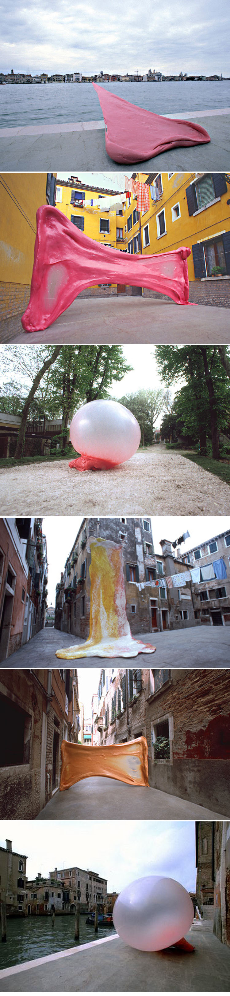 These photos are a lot of fun. Luxembourger artist Simone Decker created them in 1999, but I just happened upon them for the first time now. Decker is interested in perspective shifts and often explores the way public space is arranged. Much of her work appropriates said space as in her photographic series shown above: Chewing in Venice 1 + 2. Using photographic trompe l’oeil devices, Decker includes the streets and squares of Venice as the backdrop for her oversized gum sculptures; a proposal for sculptural work, or at least that’s the way I understand it.