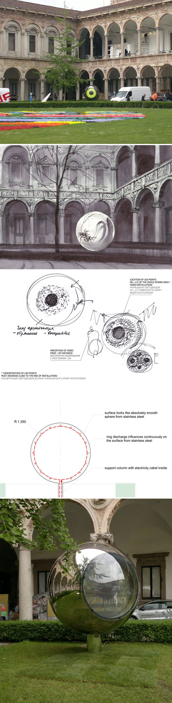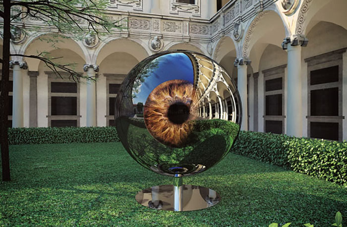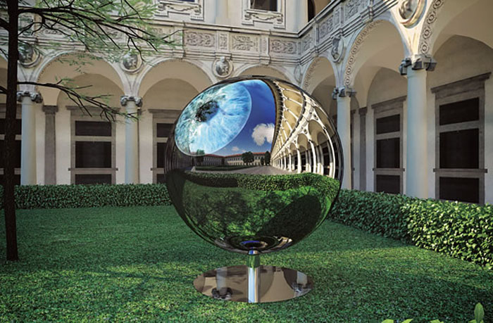 As part of this year’s Interni Legacy event at the Università Statale in Milan, in conjunction with Milan Design Week, Sergei Tschoban and Sergey Kuznetsov, partners of the Moscow based architecture studio SPEECH Tchoban & Kuznetsov, have designed a high-tech sculpture titled The Architect’s Eye. A stainless steel sphere, completely smooth and reflecting, features an LED system to create the image of a huge human eyeball that rotates to look to the sky as well as at visitors and the ground. The iris changes color and the pupil increases and decreases in size. Very cool.