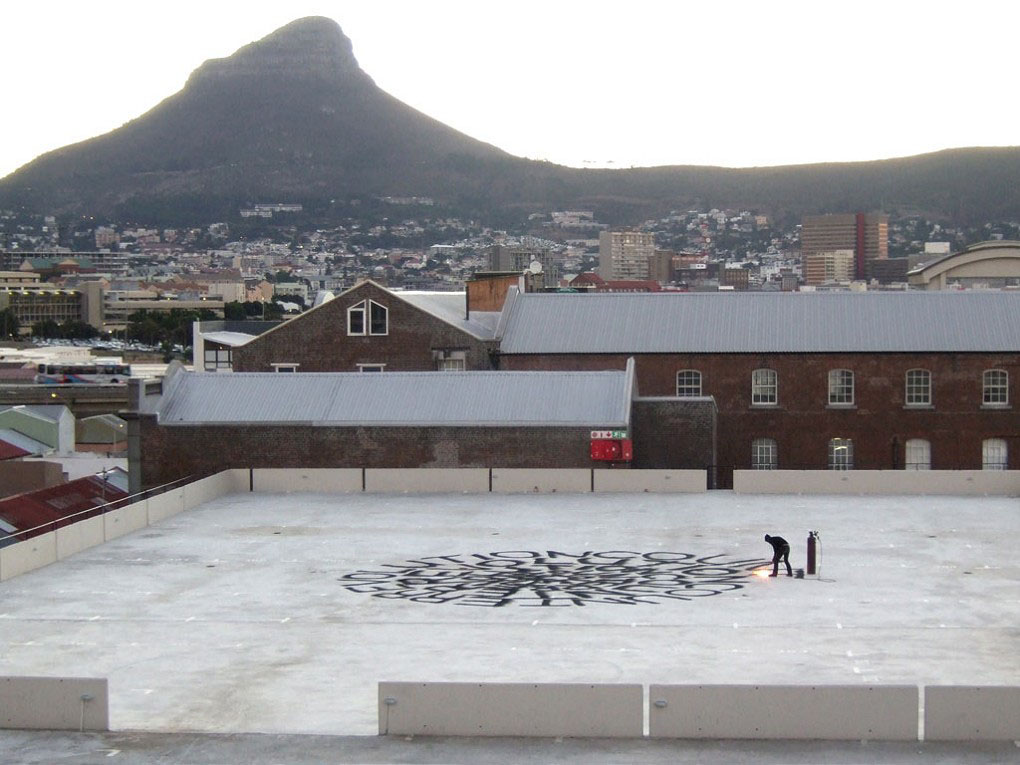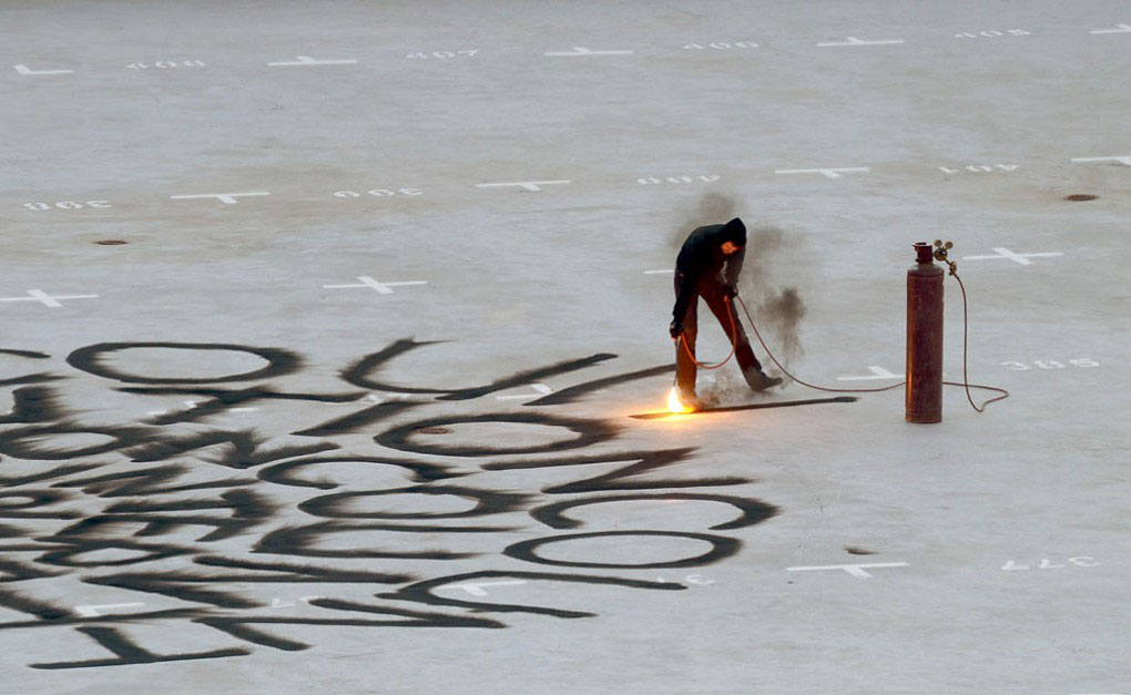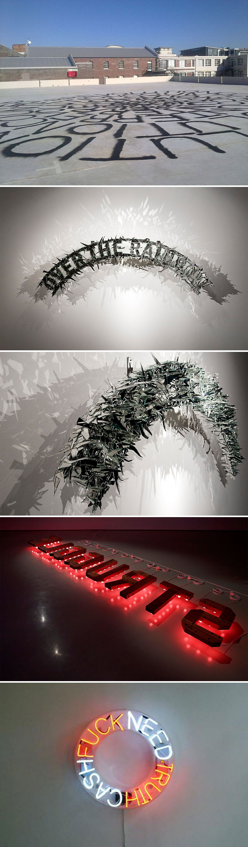 South African artist Stuart Bird creates sculptures, videos, and installations, often utilizing type, that speak to the socioeconomic situation of his present day country; South Africa’s potential for greatness existing side-by-side with empty government promises, hence the title of his recent solo exhibit: Promise Land. The show included the pieces shown here, the top three images being stills from Bird’s video Calling shot on a cellphone. The video documents the act of inscribing the words ‘Revolution’ and ‘Counter’ onto the roof of a building with an acetylene torch. From the artist:
