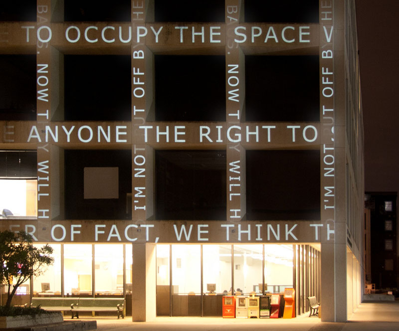A few weeks ago, The University of Texas dedicated one of their plazas to the legacy of Walter Cronkite. The newly named plaza was debuted along with media artist Ben Rubin’s (previously here) art installation titled And That’s The Way It Is; a digital interface that intertwines transcripts of Cronkite’s legendary broadcasts with contemporary journalism, projected in a beautifully choreographed manner (reminiscent of Jenny Holzer’s work) as compositions of moving text, onto the façade of the CMA building, overlooking the Walter Cronkite Plaza.