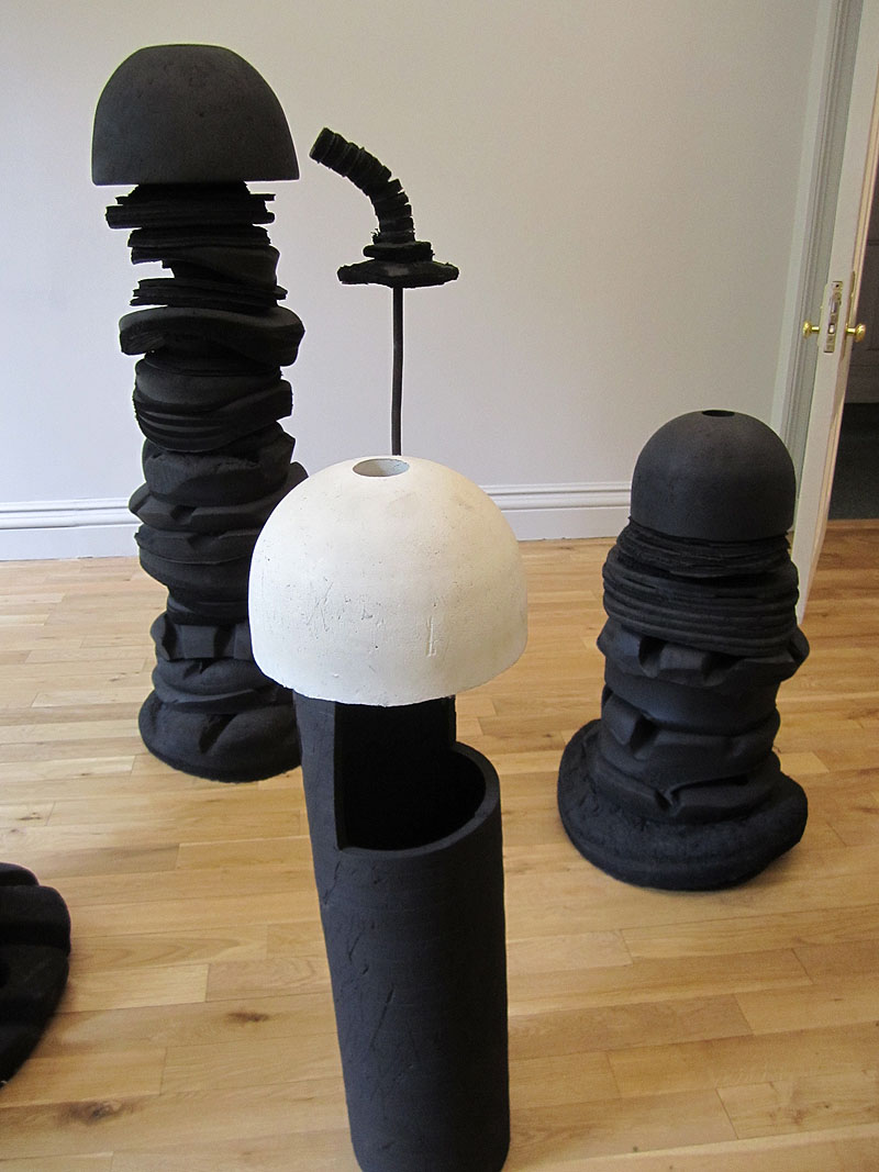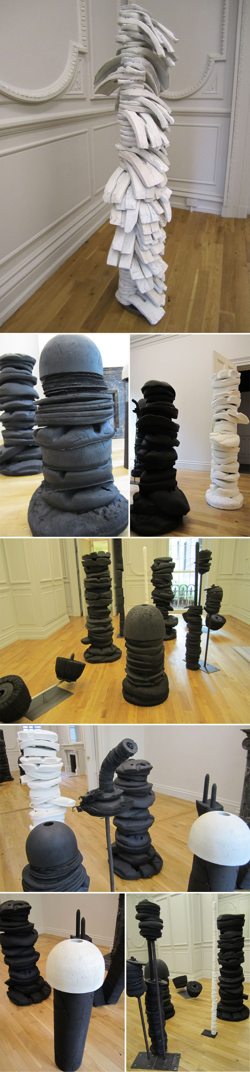 Who knew fashion designer Helmut Lang also makes sculptures? Not I. Yesterday, I went over to Washington Square to take a look. Lang has collected and repurposed materials such as tires and foam to create saggy, multi-layered totems that are a cross between fungi and phalluses. Combined with tar and plaster these mostly monochromatic pieces are rich with their original textures and indentations. There’s something very appealing about seeing them all together, as if in a surreal forest of strange vertical vegetation, many taller than me…though that doesn’t take much.