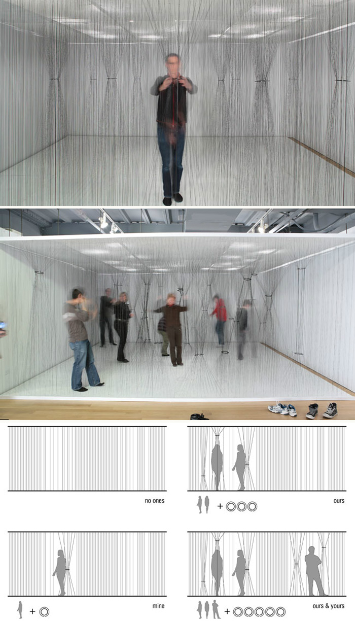 Lateral Office, an architecture firm based in Toronto and founded by Lola Sheppard and Mason White, was commissioned by the Harbourfront Centre to address the theme of ‘personal space.’ They responded by creating an installation — titled Clearing — with a dense field of over 4000 elastomeric strings running vertically along a tight grid. As people entered the space they would be given an acrylic collector tool that would allow them to navigate the field and manipulate the density of the space.