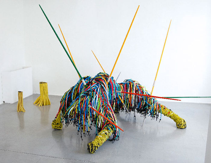 French artist Laurent Perbos belongs to the genre of artist that enjoys reappropriating the everyday and banal by converting it into art where it can be seen as playful, ironic and/or critical. He uses materials such as sports equipment, pencils, pvc piping, just to name a few. Many of his works reference mythological figures such as the sculpture at the top – made of bungee cords and javelins – titled Calydon, a wild boar from Greek mythology said to have been sent by the goddess Diane, that devastated the territory of Calydon. Below, Forest Tears, are trees and tree stumps made of pvc piping.