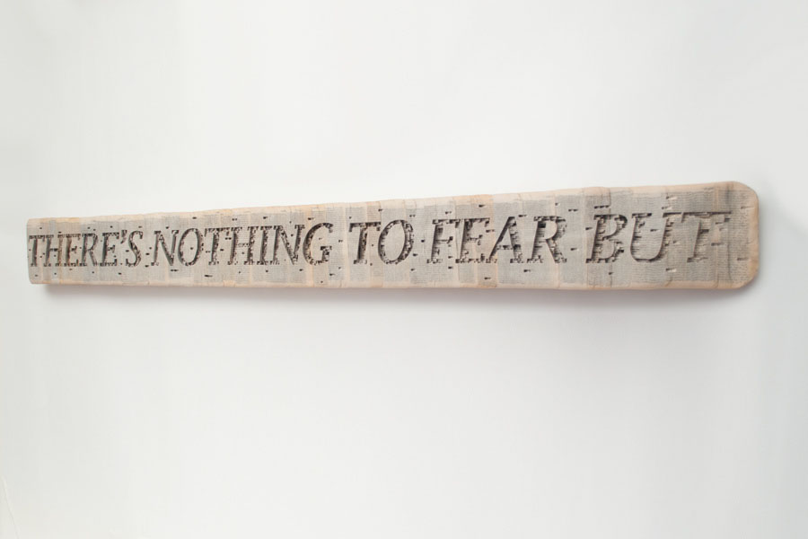 Dettmer works by cutting into the surface of books and dissecting through it. Working with knives, tweezers and surgical tools he carves one page at a time. Nothing within is relocated, just removed. Alternate histories and memories are revealed. In the case of the series of quotes above, Dettmer has cut into groups of paperbacks, sealed with acrylic, carving out the easily recognizable unfinished quotes.