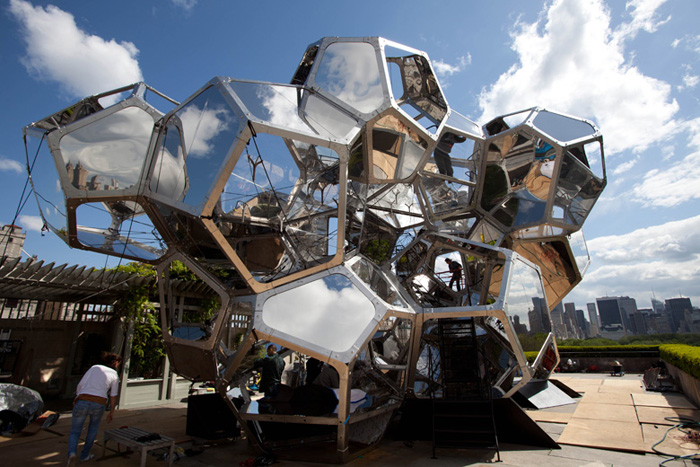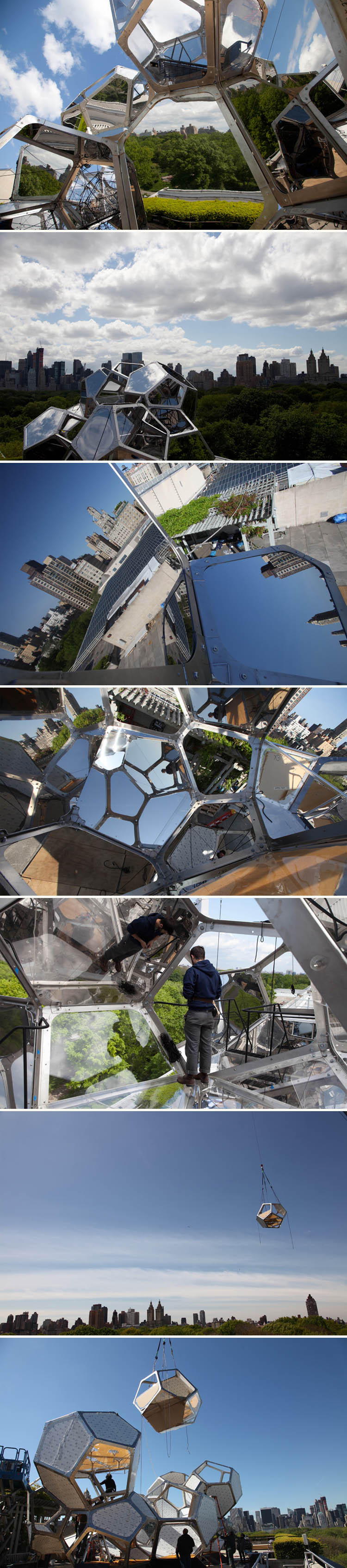 The sculptural/architectural piece atop the Met is made up of interconnected metal and acrylic modules with both reflective and transparent panels. Visitors are able to enter the structure for up to twenty minutes by obtaining a timed-entry ticket. If the regular views from the roof garden weren’t already beautiful enough, I would imagine that both, the views from the additional 20-foot high interior, as well as off of the mirrored panels on its exterior, are even more spectacular, as evident in Saraceno’s photos.