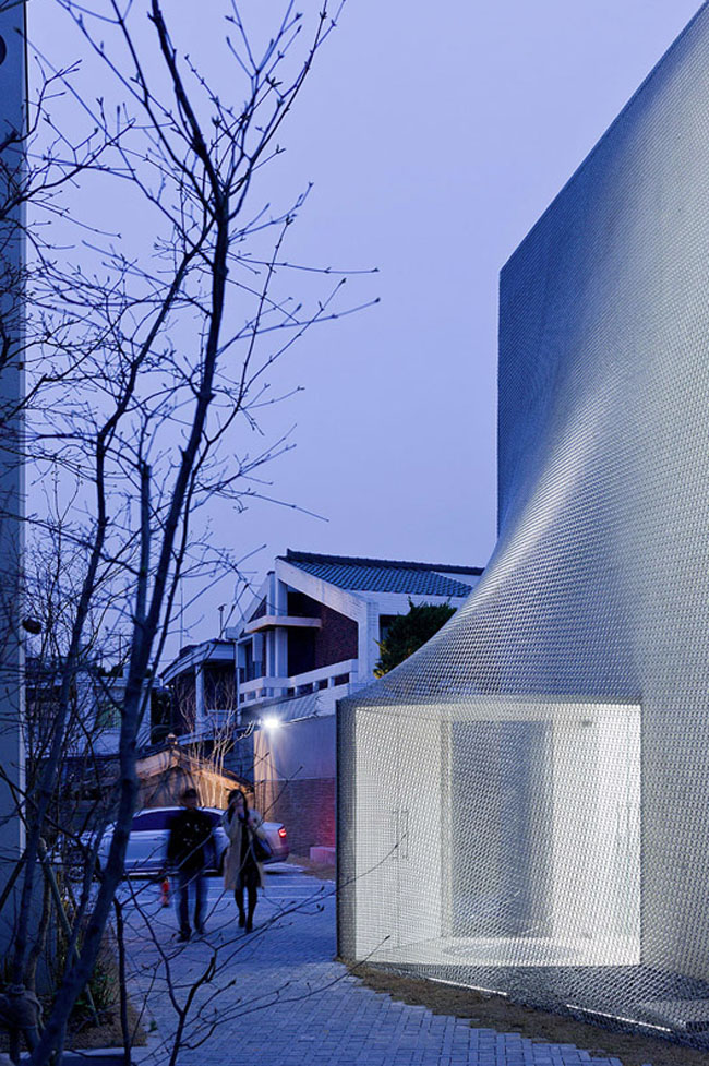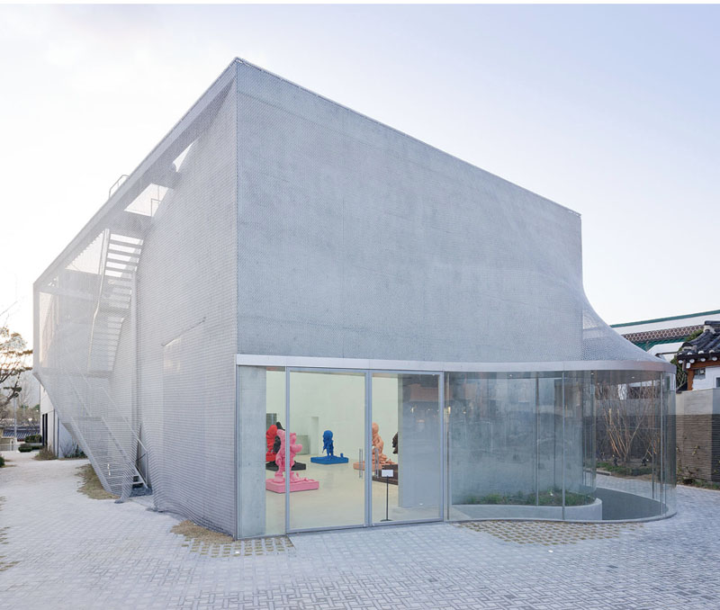 For their recently completed project in the northern part of Seoul, partners Florian Idenburg and Jing Liu of the Brooklyn-based Solid Objectives – Idenburg Liu (SO–IL) architecture studio, diffused the front of their structure for the Kukje Art Gallery with a chainmail veil. As part of their master plan for the gallery’s new “art campus”, SO–IL designed a clear-span art space in the shape of a box to house large contemporary installations. They maintained the pure geometry of the space by pushing the circulation out to the edge of the building. They felt that the white cube was too rigid within the historic environs, so, by enveloping the structure in a steel mesh, they blurred the edges and softened the appearance as a whole, in addition to creating a very cool-looking building.