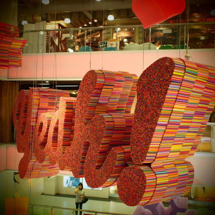 Bangkok-based multi-disciplinary design studio FarmGroup (previously here) created this fun Christmas installation at the Siam Center. Using thousands of colorful plastic drinking straws, the sculpted the word “Yeah!” along with several shapes of animals, stars, and other holiday motifs.