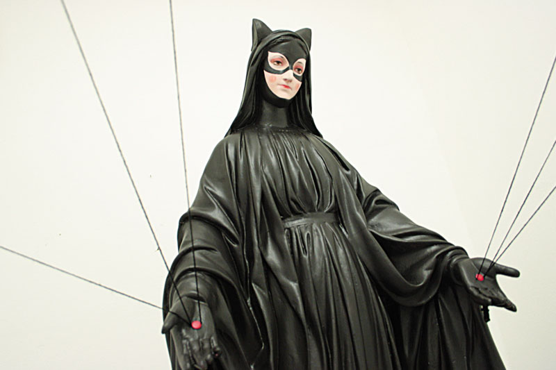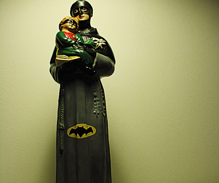 Italian artist Igor Scalisi Palminteri from Palermo has always been fascinated by religiosity. For his series of sculptures titled Hagiographies, Palminteri transformed statues of saints, purchased in the street markets of Palermo, into superheroes by repainting the sacred works with bright acrylic paint, masking their faces and converting their traditional robes into capes and superhero garb bearing their recognizable symbols. Make of it what you will…