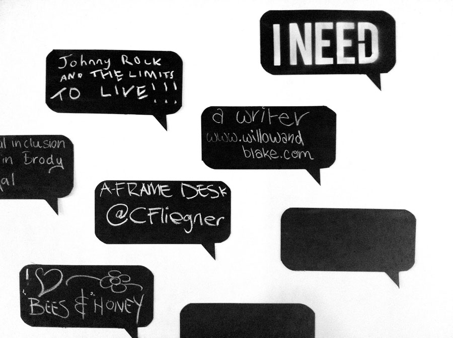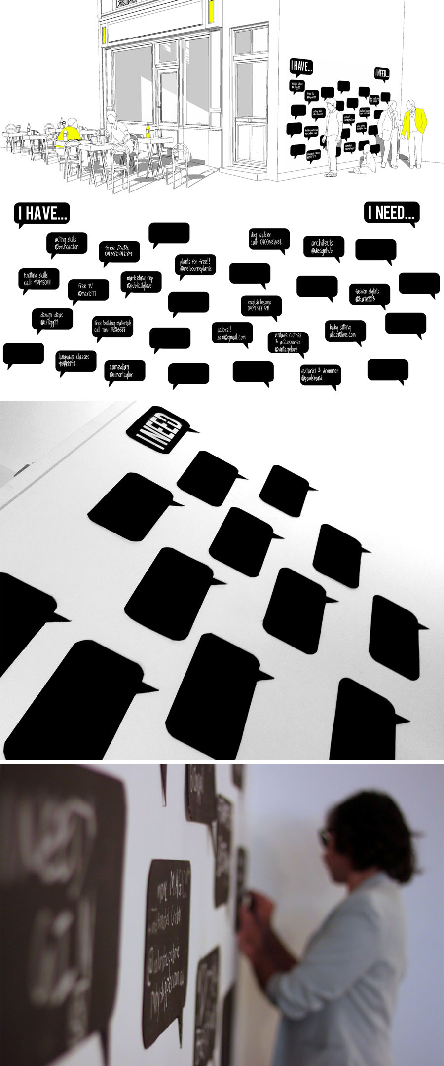 Melbourne architects Sarah Crowley (previously here and here) and Charlotte Fliegner have designed a community sharing project called I Have I Need. Using speech bubble-shaped chalkboards, they have created a series of installations where the community can write down goods or services they have to offer, or items they need along with contact details.