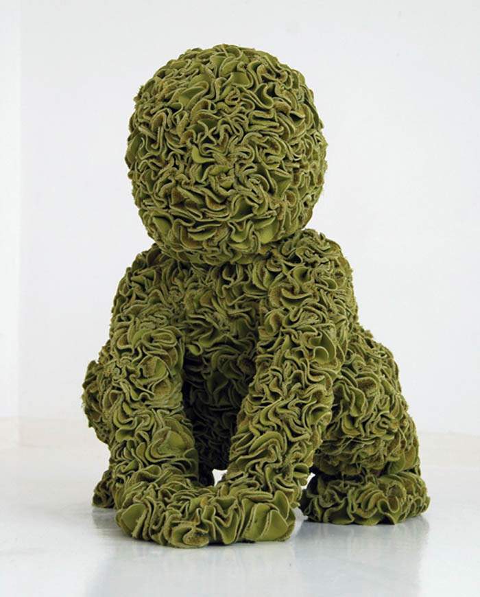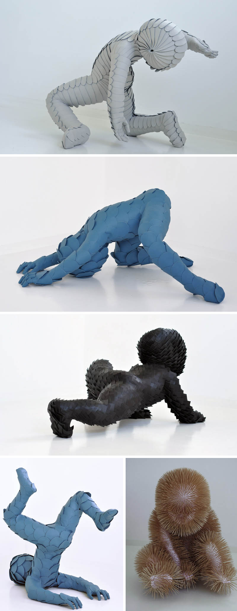 I create an image from synthetic material or clay, letting myself be led by thoughts, associations and emotions. What do I see in the shape, what sort of feeling do I get, what does it remind me of, what am I saying with this? And, is this what I want to make? Once the image is finished, I cover it either partially or entirely with a “skin” of a different material. The choice of skin depends on the image. In contrast to the spontaneity at the beginning of the work process, when I make the skin I work in a very structured manner. For weeks, with great patience and discipline, I cut, paste or prick, following self-imposed rules such as, “all forms in the same rhythm” or “all lines continue onward”.