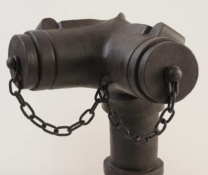 Los Angeles-based artist Ben Jackel uses primitive materials and old traditions to look at the contemporary world. He is interested in the history of warfare and its tools, from 15th Century halberds to present day spy planes, and has recreated versions of them in mahogany coated in graphite. As a counterpart to these, Jackel has made a series of emergency tools using stoneware and beeswax that include fire hydrants, standpipes, alarms, axes, and fire hoses. These tool sculptures both contrast and complement the war-themed ones; they, too, represent powerful forces at the ready.