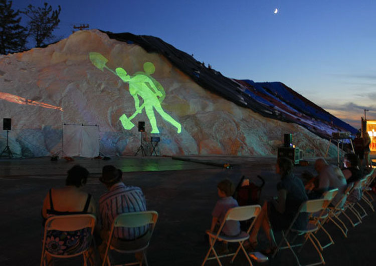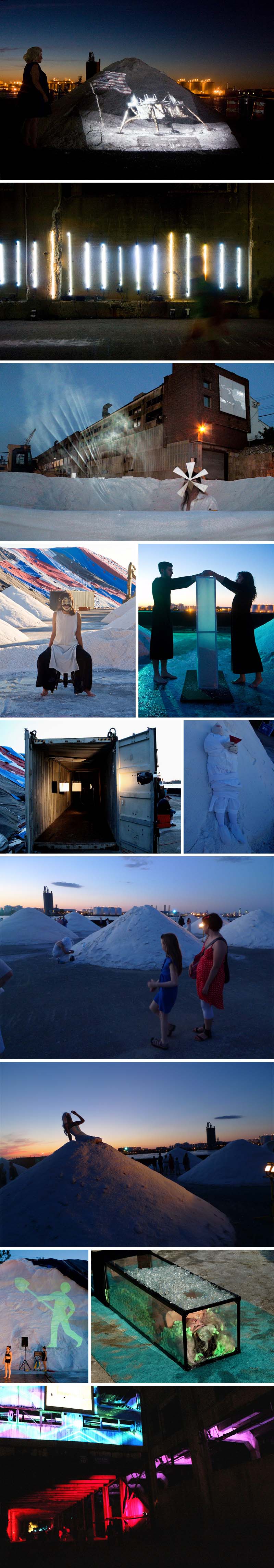 BUT, back to the topic of this post: Lumen 2012. Over on the industrial waterfront property of Staten Island, more specifically, the Atlantic Salt Company—the company that supplies road salt to the city during its snowy winters—all sorts of light-related exhibits took place. Due to an almost snowless winter in NY this year, the piles at the New Brighton company are still high with over 150,000 tons of salt, some piles as high as 5 stories. Roughly 50 artists, projected and performed their works on and around the mounds of salt, which (at least in the photos) looks very cool and in some cases Felliniesque. I wasn’t able to match many of the works with their artists, but here are the ones I found, followed by a link to a list of all the participating artists.