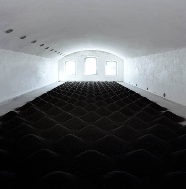 French sound and visual artist Pascal Broccolichi creates installations that envision sound as a vocabulary of forms, but whose focus is on listening. In his piece Raccorama (top four photos) Broccolichi takes mica dust and places it in identical heaps, following a specific pattern which is then emphasized by iodide spotlights. Loudspeakers play a sound piece simulating the patterns of sound flux in motion.