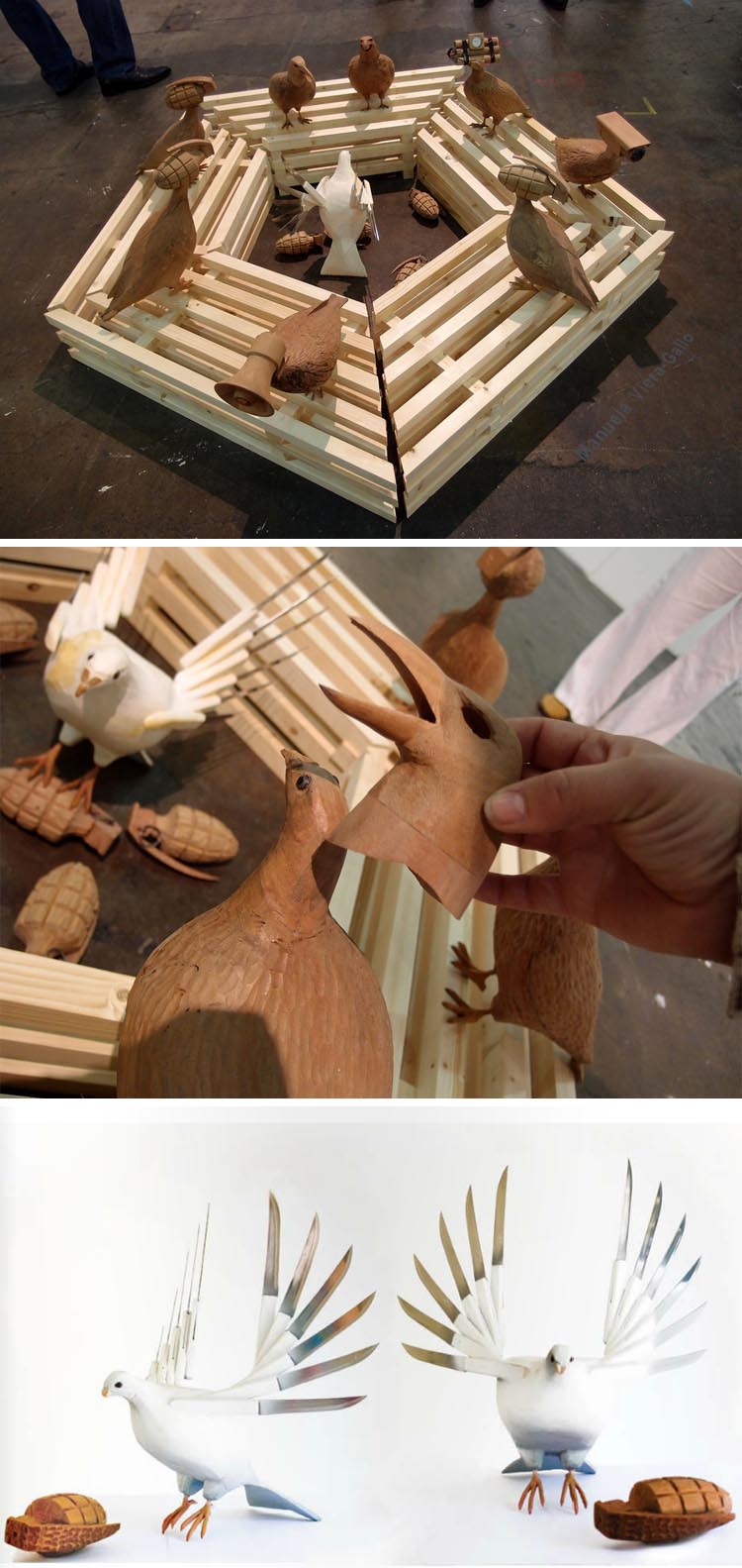 New York-based artist Manuela Viera-Gallo was born in Rome to politically-exiled Chilean parents, and later grew up herself in Chile. Her point of view has, since then, been strongly shaped by the social and political violence that has affected the history of most Latin American countries. One of her recent works titled Pentagon, consists of a “basket” of wooden pigeons with their heads replaced by explosives and megaphones standing on a pentagonal wooden coup. Viera-Gallo’s piece mocks the U.S. Department of Defense.