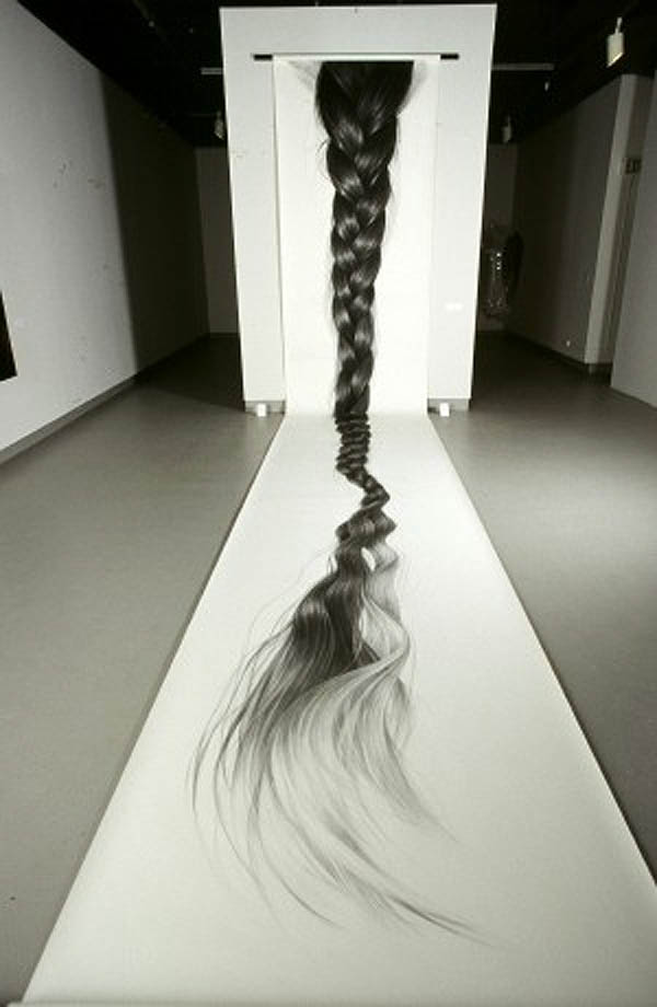 Much of her work revolves around hair, something she identifies with, and characterizes her to some degree through her own long hair, in addition to being something Zhang finds both beautiful and at times repulsive. She has charcoal drawings on larger-than-life scrolls to emphasize the length, and very realistic oil paintings on the subject matter as well. She also combines hair with everyday objects to make humorous and surreal pieces.