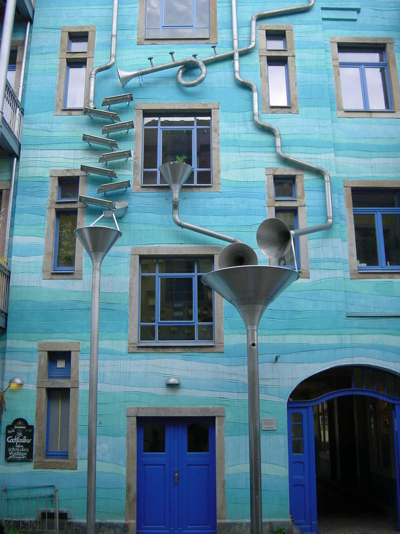 Tucked away in a student district of Dresden, Germany, you’ll find Kunsthof-Passage, a series of buildings and courtyards that encompass a farm collective as well as shops and cafés. Walking through these buildings into the courtyards leads to a fun surprise: the Court of Water. Using the gutters, metal pipes and funnels, architect Heike Bottcher designed a Rube Goldberg-type contraption that plays “music” when the rain comes down and through. Though this installation is probably the most fun, there are other artistic façades in Kunsthof-Passage including the Court of Mythical Creatures and the Court of Metamorphosis. The whole thing screams fun artist community and seems to be well worth a visit if you find yourself in town.