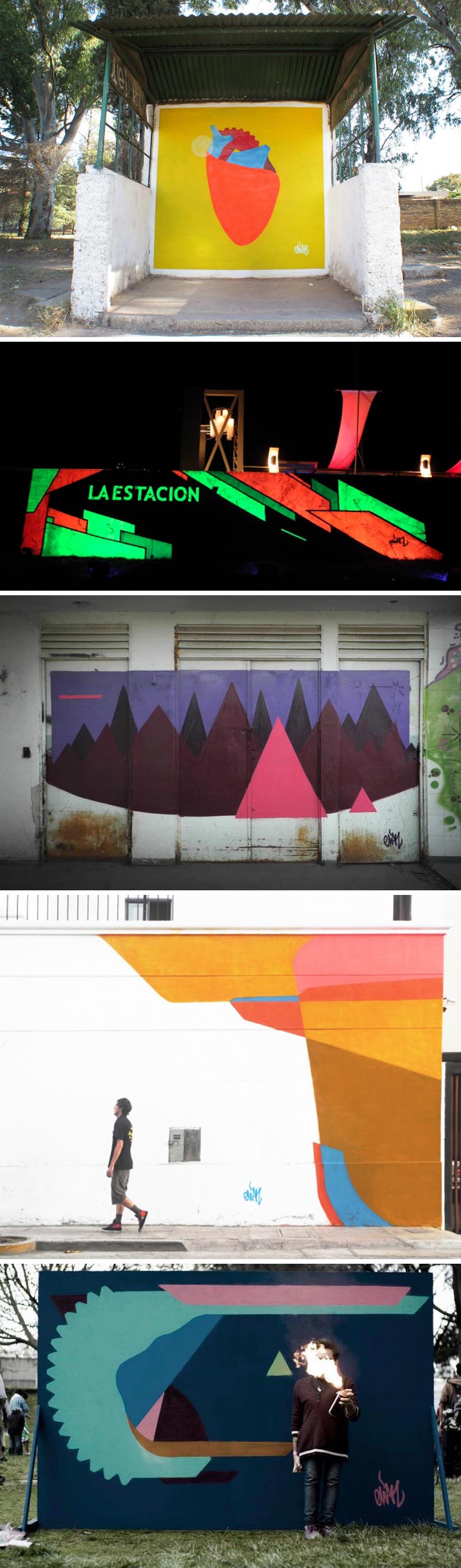 Elian is an Argentinean street artist from Córdoba who creates colorful geometric street murals. I like the clean lines and color palettes on these murals, and the transparency effect on the top one is clever, but there’s lots more to see on his site and flickr as well.