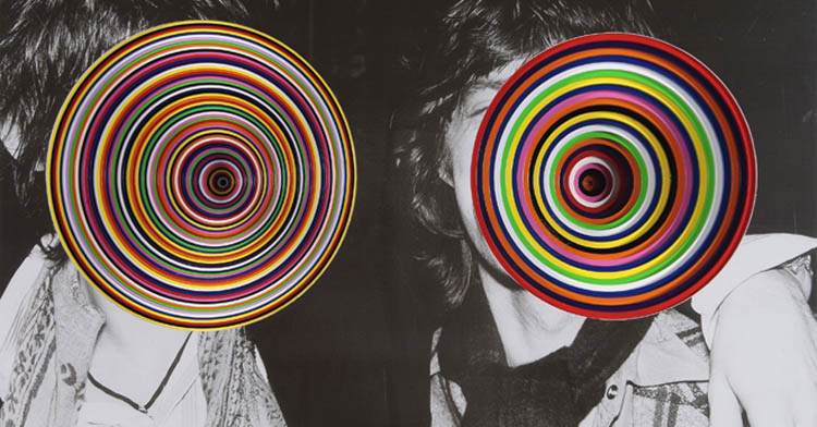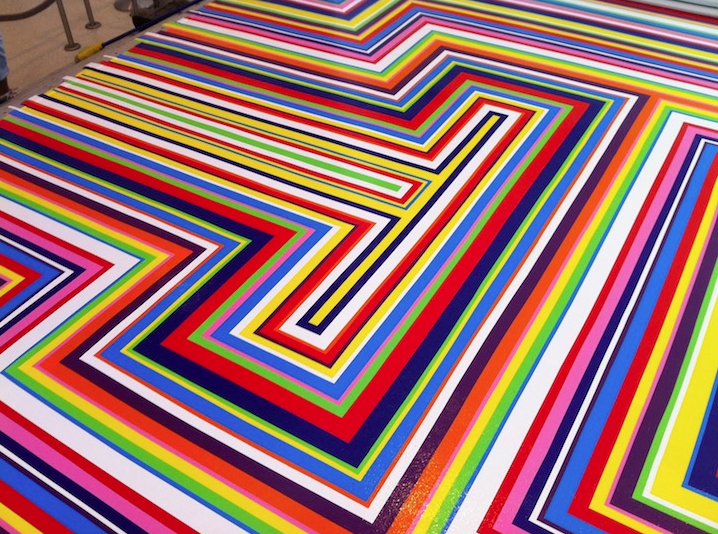 I love it when random bits of information coincidentally relate to other random bits of information. There’s that ridiculously satisfying “Aha” moment, where you feel like Sherlock Holmes or Columbo, but without having done any real sleuthing. That’s how I feel with respect to my recent revelations about Jim Lambie, a Scottish visual artist. Last fall, I happened upon an exhibit of Lambie’s work at the Anton Kern Gallery in Chelsea. My favorite pieces involved concave, colorful conical forms embedded within large photographs of Mick Jagger and Bob Dylan. Later I spotted another similar piece at the NY Frieze Art Fair. Around the same time I did a post on an interesting townhouse renovation in our neighborhood, and creepily photographed the colorful staircase with its tape design from the window. Fast forward to today, when I came across photos of interesting taped floors created by none other than Jim Lambie. Among these images I found the same Greenwich Village staircase taken from inside and above. So, yes, you’ve probably made the mad leap yourself by now: Jim Lambie, who transforms spaces with his very cool taped geometric mazes of color, was the artist whose exhibit I saw in Chelsea and a few weeks later admired his impressive design work on the local staircase. Case closed.