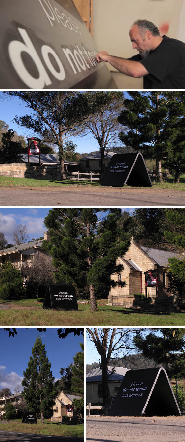 Superficially speaking the work takes its form and language directly from the actual warning signage developed and used extensively by Sculpture by the Sea. However to the artist it represents not only a site and event specific proposition, but more significantly a personal protest against what is quite simply a “sign of the times”. How is one able to do anything anymore?