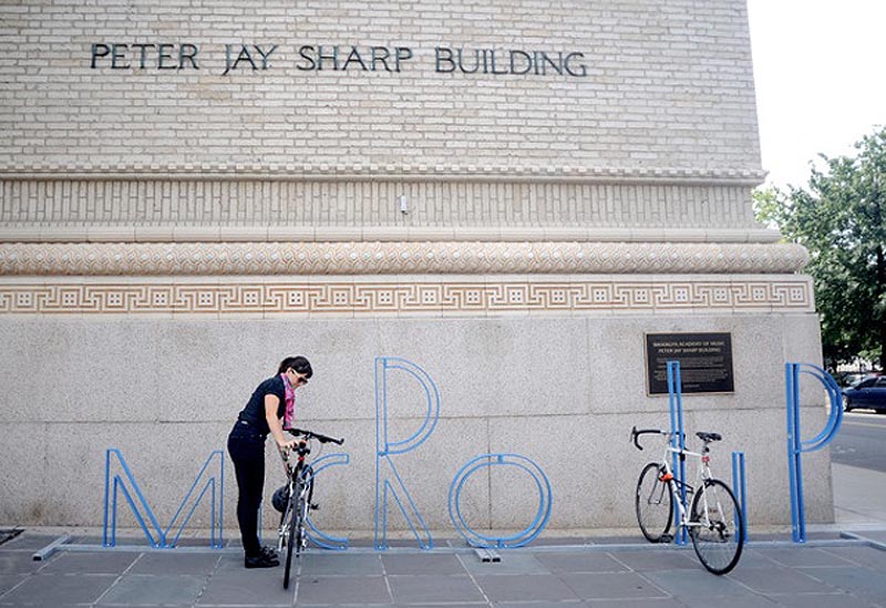 David Byrne is at it again. The well-known musician, who is often seen cycling around town, was invited by BAM (Brooklyn Academy of Music) to design new bike racks to replace their old utilitarian ones. Byrne, having designed a series of fun bike racks for NYC in 2008 with shapes ranging from dogs and cars to high heels and guitars, decided to go typographic this time around. Realizing that with a semi circle, line and ‘v’ shape he could create most of the letters of the alphabet, he designed racks that create different words. The racks installed yesterday spell out “Pink Crown” and “micro lip” both chosen by designer Byrne. The bike rack words will change periodically, and BAM may be soliciting suggestions from its audiences in the future for new words.
