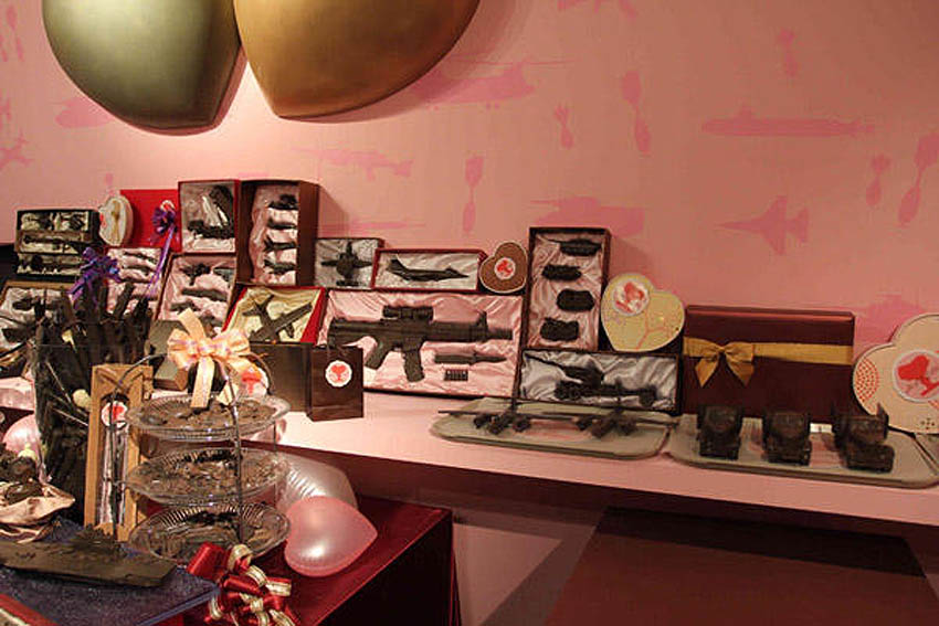 Taiwanese artist Tu Wei-Cheng likes to create illusions and hoaxes with his art. One such work is his large-scale installation titled Happy Valentine’s Day: a chocolate shop complete with hearts, ribbons and pink walls, except that the chocolate boxes are filled with tiny chocolate tanks, guns, hand grenades and other arms and artillery.