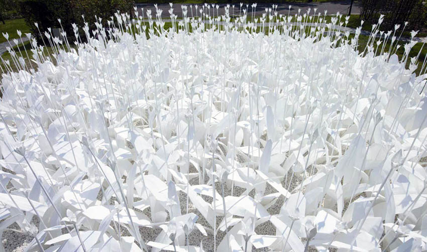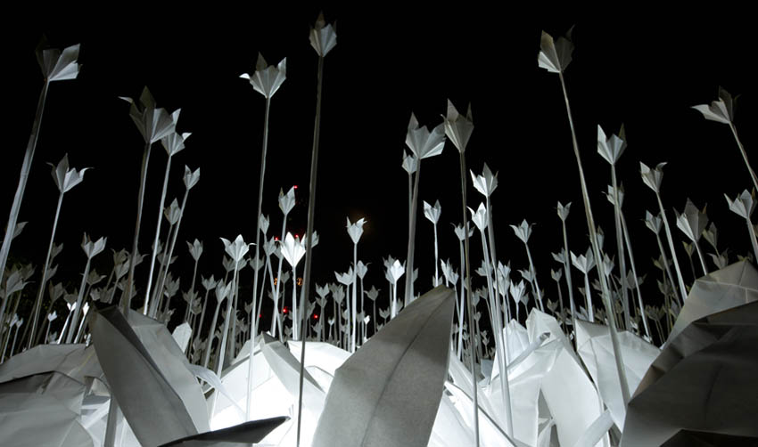 Swiss landscape architect Anouk Vogel lives and works in the Netherlands. Her Paper Garden titled Folding for Peace, was commissioned by the Gardening World Cup (who knew?) in Nakasaki, Japan, last year. Inspired by an ancient Japanese legend which promises that anyone who folds a thousand origami cranes will be granted a wish, such as long life or recovery from illness, Vogel folded thousands of paper flowers and plants with the wish for world peace.
