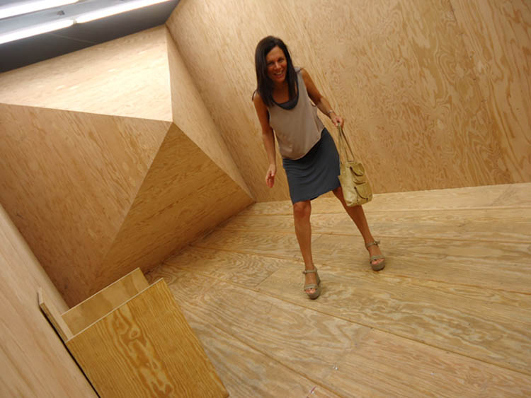 My friend Eric and I strolled over to Chelsea on Saturday between tornado warnings. We stopped by numerous recently-opened exhibits, but the most memorable show perhaps, at least for me, was Julian Hoeber at Harris Lieberman Gallery. Actually, more specifically, it was the centerpiece of the exhibit, DH#2, that was most memorable. This tilted wooden box held together with metal studs, beckons to you through its door. Inside is a steeply inclined room that is amazingly difficult to stand in and makes your head (and stomach) do somersaults…even just looking at these photos again is bringing back that queasy feeling. But it’s definitely fun and incredibly surprising. Makes for some laughs (and a little nausea.) DH#2 is, apparently, a variation on the Los Angeles artist’s previous work Demon Hill (the latter pictured in the top and bottom photos.)