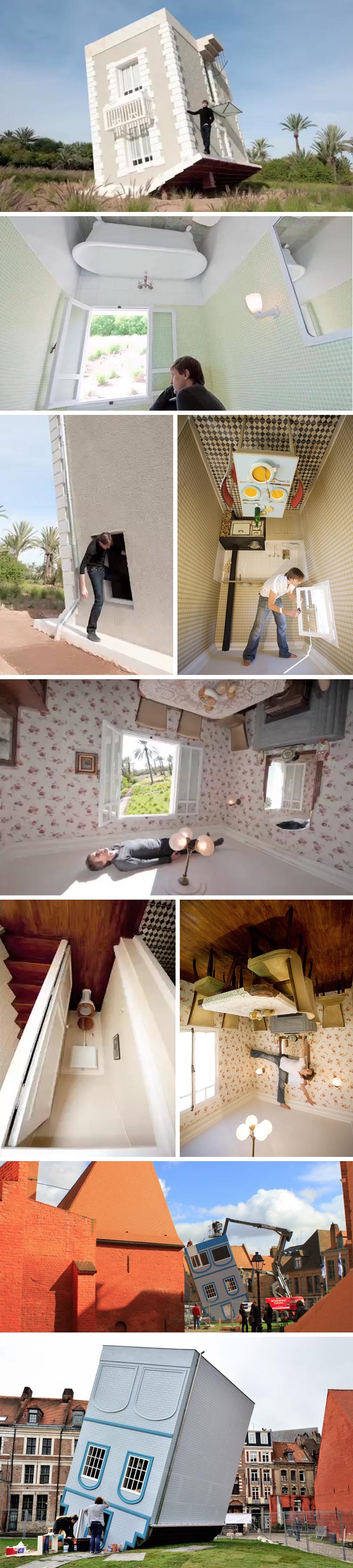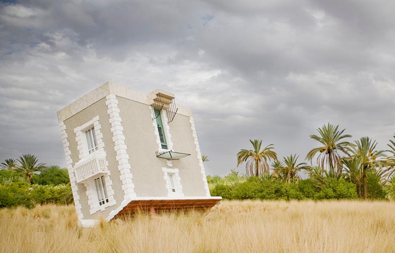 French artist Jean-François Fourtou has always wanted to be an architect. Through a series of experiments in his studio in Madrid, Fourtou played with dimension and proportion, mostly distorting them, and applying these experiments to a decade-long project of installations on his property in Morocco. Tombée du Ciel (Fallen from the Sky), the upside down house inspired by his grandparents’ home in France, reproduced to scale and plopped on its roof with its entrance via window, is one of these works. Reminiscent of scenes from books such as Alice in Wonderland or Gulliver’s Travels, the experience of walking on the ceilings (or, if you’re Lionel Richie, perhaps dancing) must evoke both a disorienting and funny feeling. Can’t help thinking of Stray Light Grey a little bit.