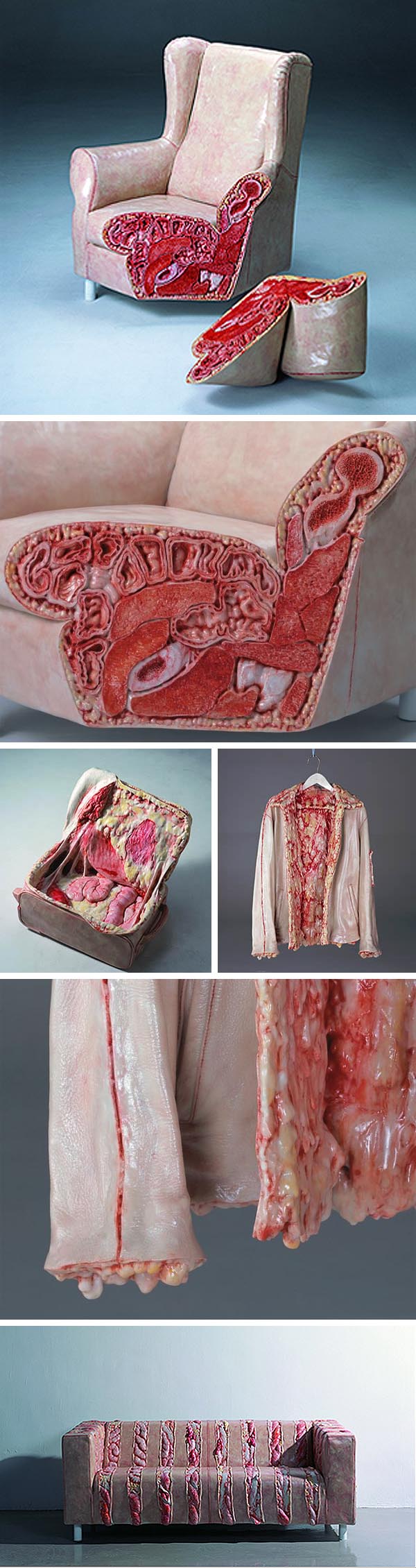 I can’t really say that I ‘like’ these sculptures by Chinese artist Cao Hui, but they certainly are hard to ignore and impressively executed. Cao Hui, based in Beijing, is known for his shockingly realistic sculptures of half-flayed animals. More recently he has applied this technique to the unexpected: furniture and objects. These resin and fiber sculptures, that surprisingly ooze entrails at their seams, are all part of Cao Hui’s interest in realisim, deception, and the artist’s power of control. The belief that the interior and exterior of everything possess a perfect logic is now humorously questioned by the artist. Definitely not for the squeamish.