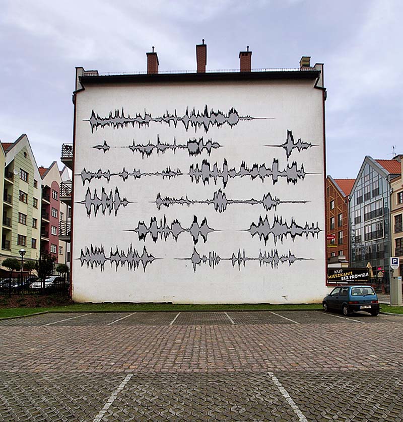 This is an interesting project. Adriana Ronżewska Kotyńska, a Polish architect and painter interested in public art projects, originated the concept behind the Audiomurale and then executed it, with a team, on the wall of a townhouse in the Old Town district of Elblag, Poland, a town extensively damaged at the end of World War II that waited until the 1980s for major reconstruction. The mural is in part a revitalization effort. Kotyńska and her team conducted interviews with passers-by recording their remarks about their town. Selected opinions – including some unprintable remarks – were transferred onto a blank wall of a townhouse in the form of spectrograms (i.e. sound wave patterns); the ‘voice’ of Elblag. The project is intended as a temporary – though not short-term – intervention. The final mural requires a key which will be provided in the form of a display board with a QR code that will enable access to recorded interviews via a mobile phone.