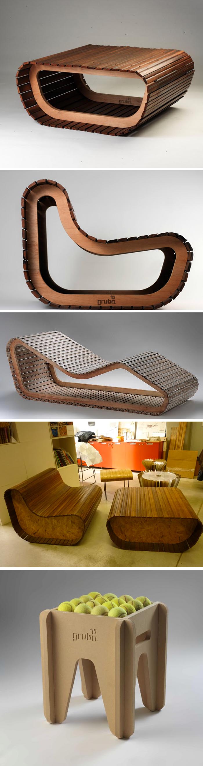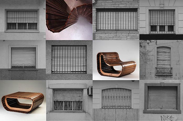 Argentinean architects Maria Constanza Nuñez and Gabriel Pires Mateus are the duo behind Gruba. Committed to the creation of spaces and objects that provide alternative green solutions, Gruba works with salvaged materials. In their S.O.S. de Barrio Line they repurpose wooden roller blinds which are usually discarded in the neighborhoods of Buenos Aires. Each chair or table has unique characteristics depending on the reclaimed roller blind.