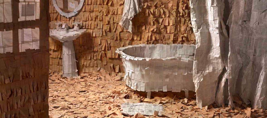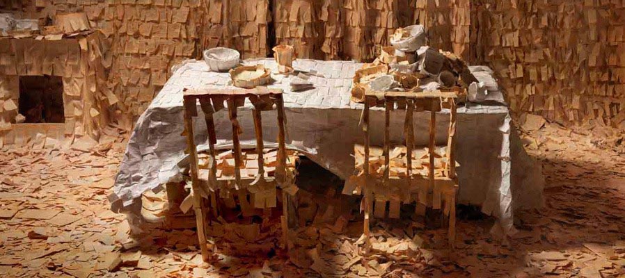 Argentinean artist Pablo Lehmann (previously here) has been developing his installation The Scribe’s House (La casa del escriban) for two years, and it is scheduled to debut at Art Basel in Miami this December. In the meantime, the NYC Rockefeller Center Anthropologie store has a variation of The Scribe’s House on exhibit. Composed of browned and torn book pages, the studio-like apartment installation has a collapsed bed, bookcase, and picture frame all made with thousands of book pages cut into strips and hanging from the ceiling, walls and covering the floors as well as in the shapes of the collapsed furniture. By cutting and layering, Lehmann creates texture and dimension.