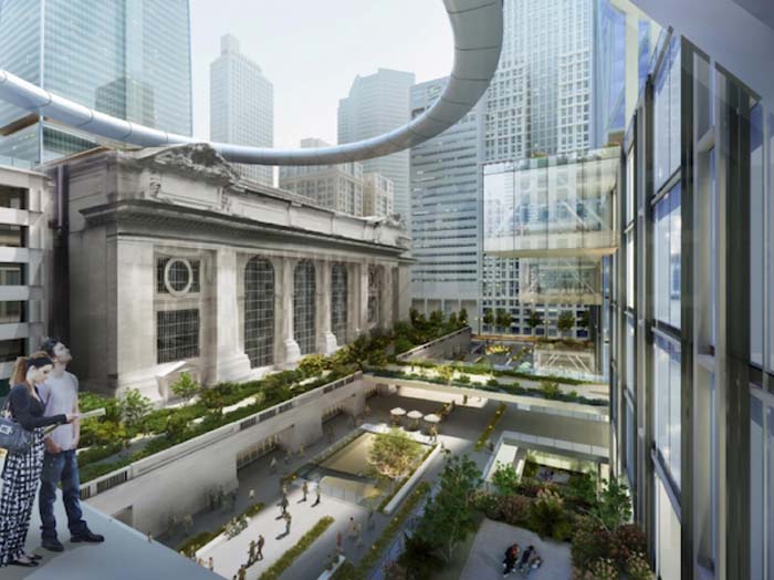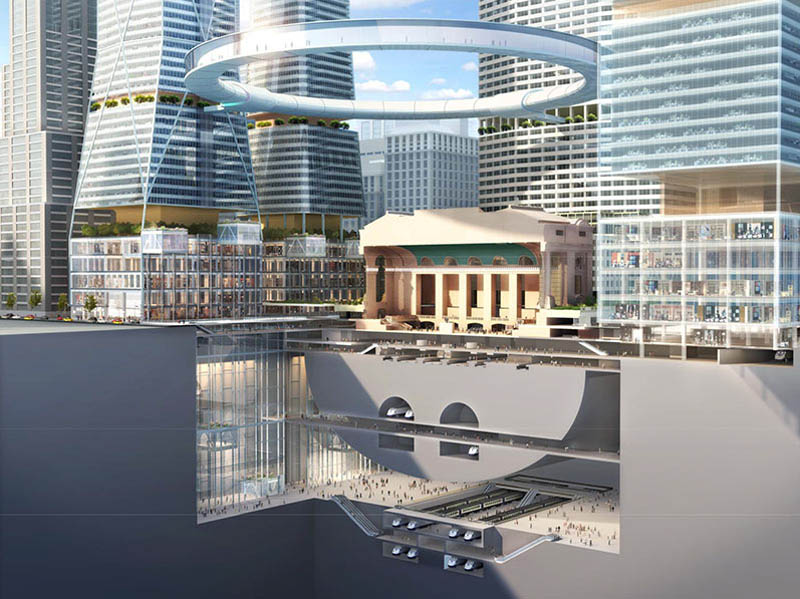 Nope, it’s not the set design for a Jetsons revival film; not even for the upcoming Blade Runner 2. These renderings are SOM’s (Skidmore, Owings & Merrill) response to the Municipal Arts Society’s (MAS) invitation to re-envision Grand Central and its environs on the occasion of the terminal’s centennial anniversary next year: Grand Central…The Next 100 project. The three firms asked to participate were SOM, Foster+Partners, and WXY. All three came up with interesting proposals offering relief from overcrowding and traffic, as well as being committed to the pedestrian and public space, focusing on converting Privately Owned Public Spaces (POPS) to Privately Funded Public Spaces (PFPS). SOM went futuristic and monumental, a plan that is hard to ignore with its dramatic panoramic ring rising and lowering above Grand Central—like a halo elevator—between two new towers.